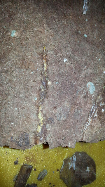 The second day began with me finally getting to see the Judy Block, which I talked about a while ago while it was on the 4th floor, installed in the Paleontology Hall. It’s a pretty impressive specimen; check out the pictures below! I also worked with another volunteer, Hollister, to look at a small piece of the Judy Block that had been removed from the main specimen. We also looked specifically at a small piece that was broken off and broken in half. We came to the conclusion that it’s most likely part of a shark spine. The interesting thing was that the inside of the bone contained small, round, red objects within the grooves on either side of the yellow center. We’re really not sure what these things are, but they did look somewhat like red blood cells. That being said we both acknowledged that blood has only possibly been found in a bone, not as old as this one, once that we knew of. So it’s very possible that it could be something else, but we were just exploring the options which is what science is.
